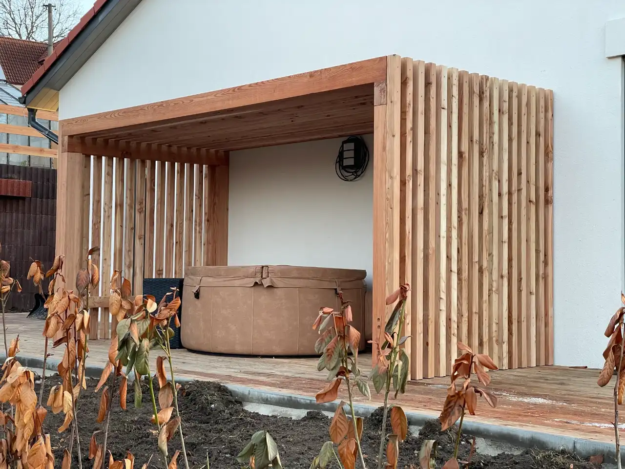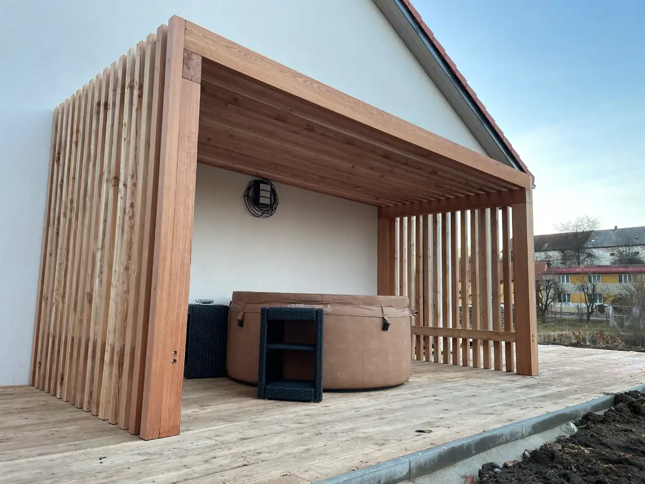 • Součástí zakázky byla také výroba a montáž dřevěné konstrukce pro zastřešení venkovní vířivky. Konstrukce je vytvořena z masivního dřeva, působí lehce a přirozeně a zároveň poskytuje: