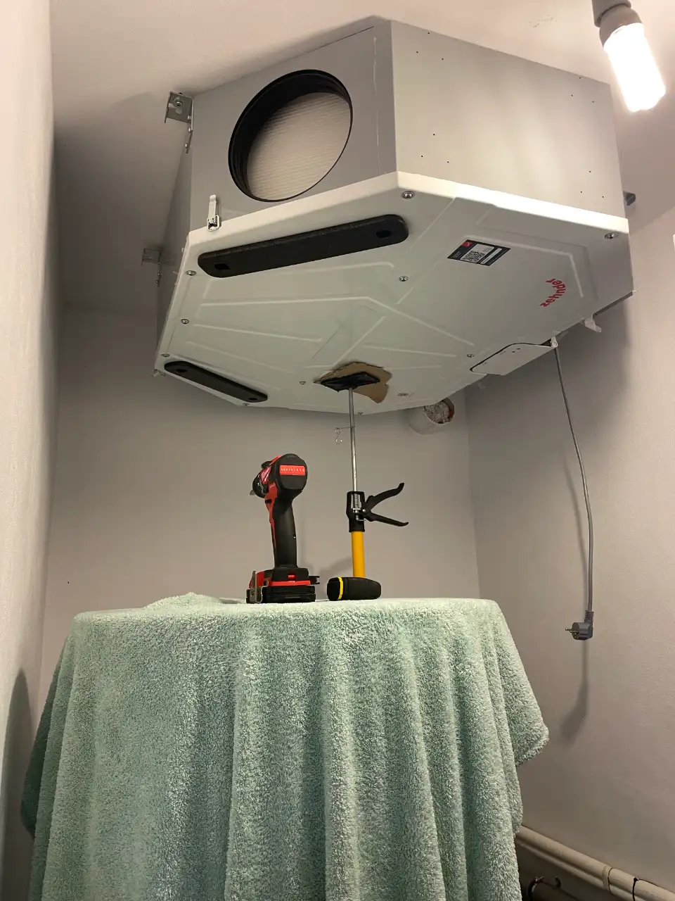 Rekuperační jednotku Zehnder ComfoAir Flex 350 jsme napojili na exteriér pomocí izolovaného potrubí ComfoPipe Compact 160 EPP. Pro přesné a technicky správné provedení bylo nutné provést jádrové vrtání, přívod i odvod vzduchu jsou zakončeny nerezovými fasádními mřížkami.