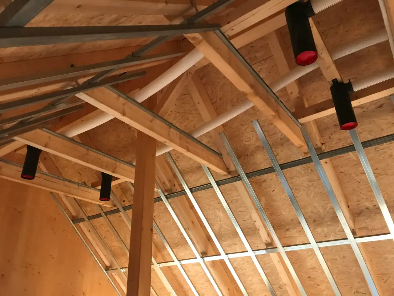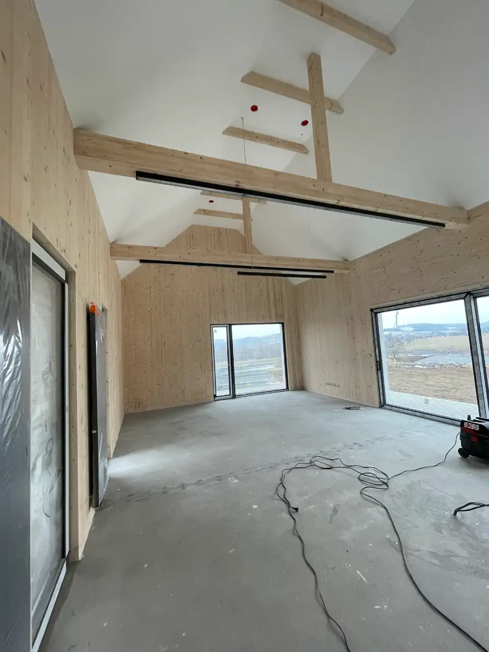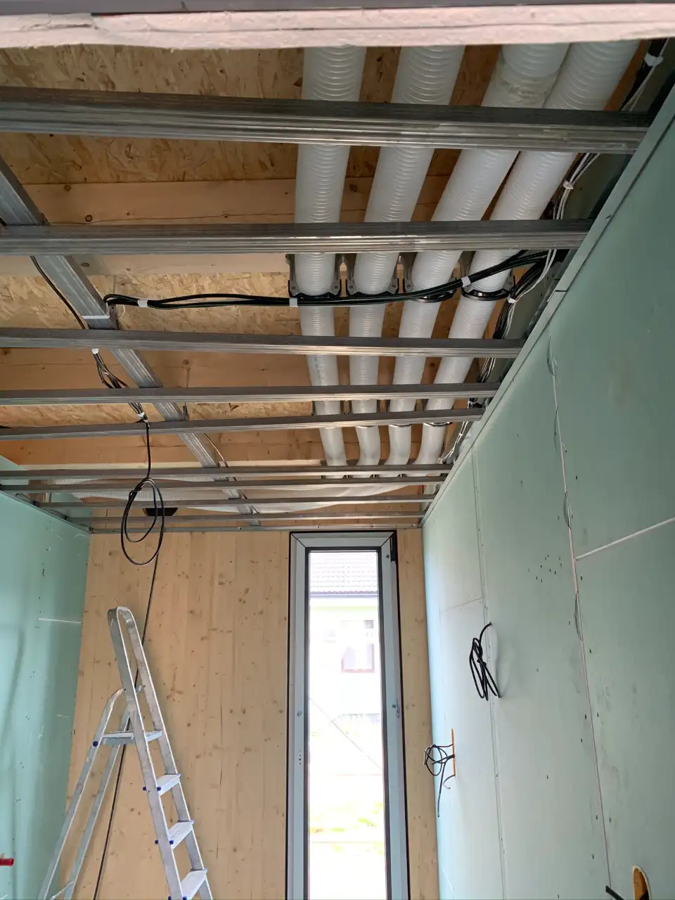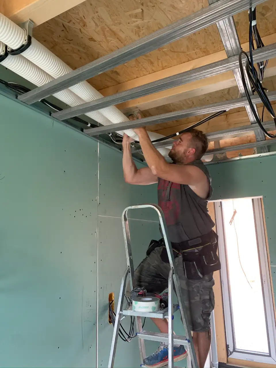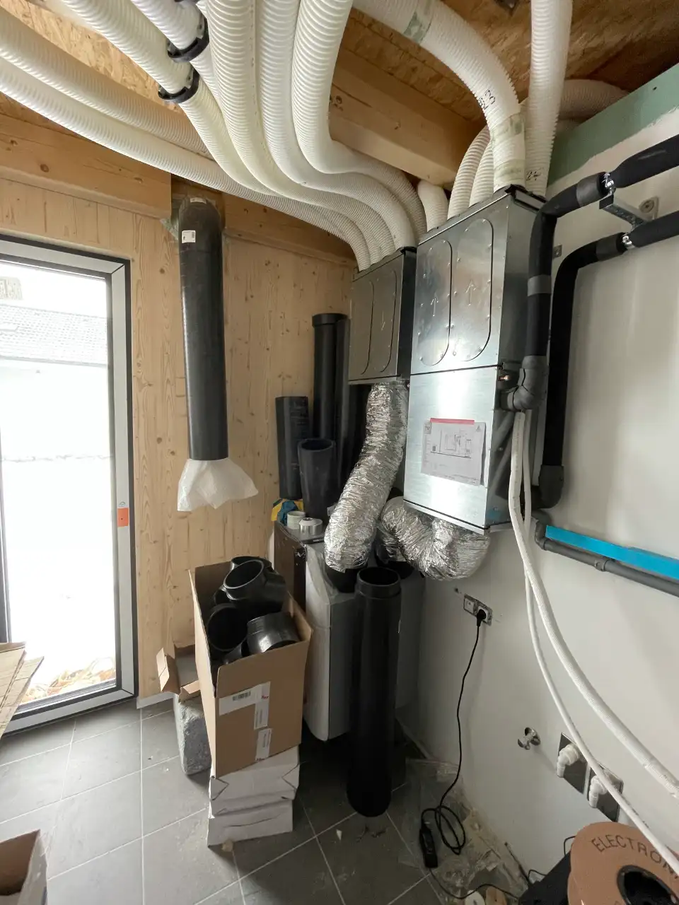 Realizace systému řízeného větrání u této dřevostavby probíhala od prvních příprav až po finální měření těsnosti. Nejprve jsme připravili trasy a prostupy pro rozvody vzduchu, které jsme následně uložili do stropních a stěnových konstrukcí. Ve všech místnostech jsme instalovali potrubí Zehnder ComfoTube, které jsme pečlivě vedli tak, aby zůstalo kompletně skryté a nenarušovalo interiér. Na koncích rozvodů byly osazeny kryty vývodu vzduchu TVA-P a talířové ventily ComfoValve, které zajišťují přesné a tiché proudění vzduchu.