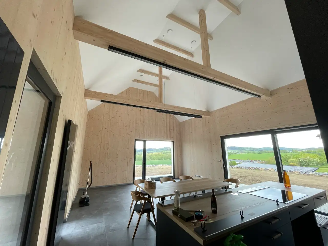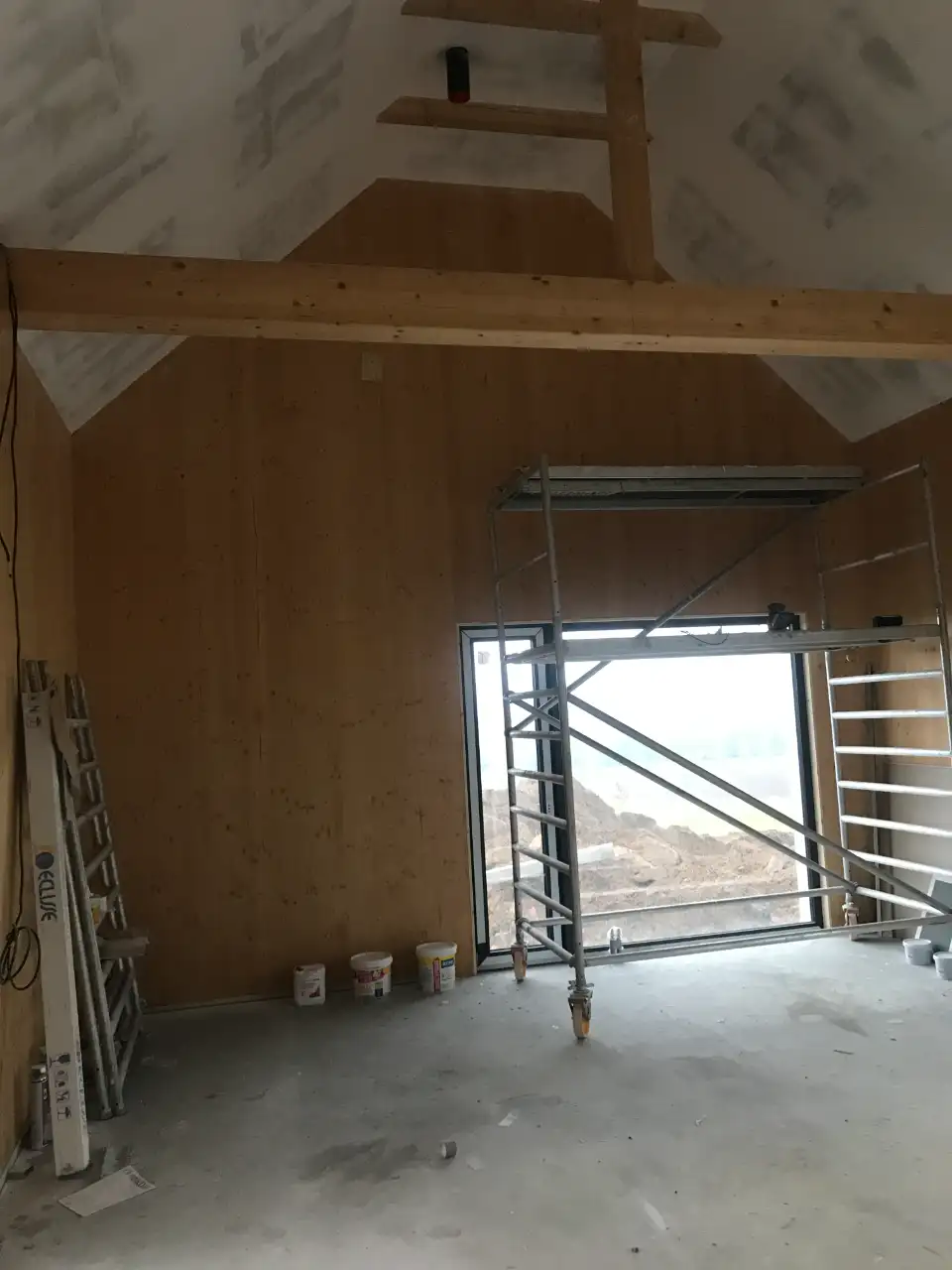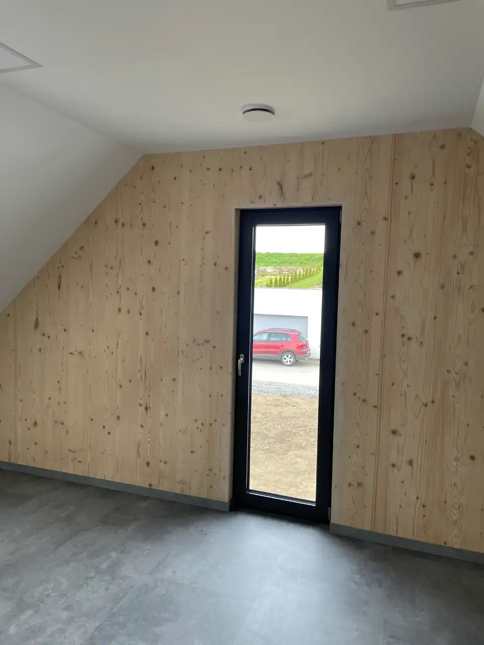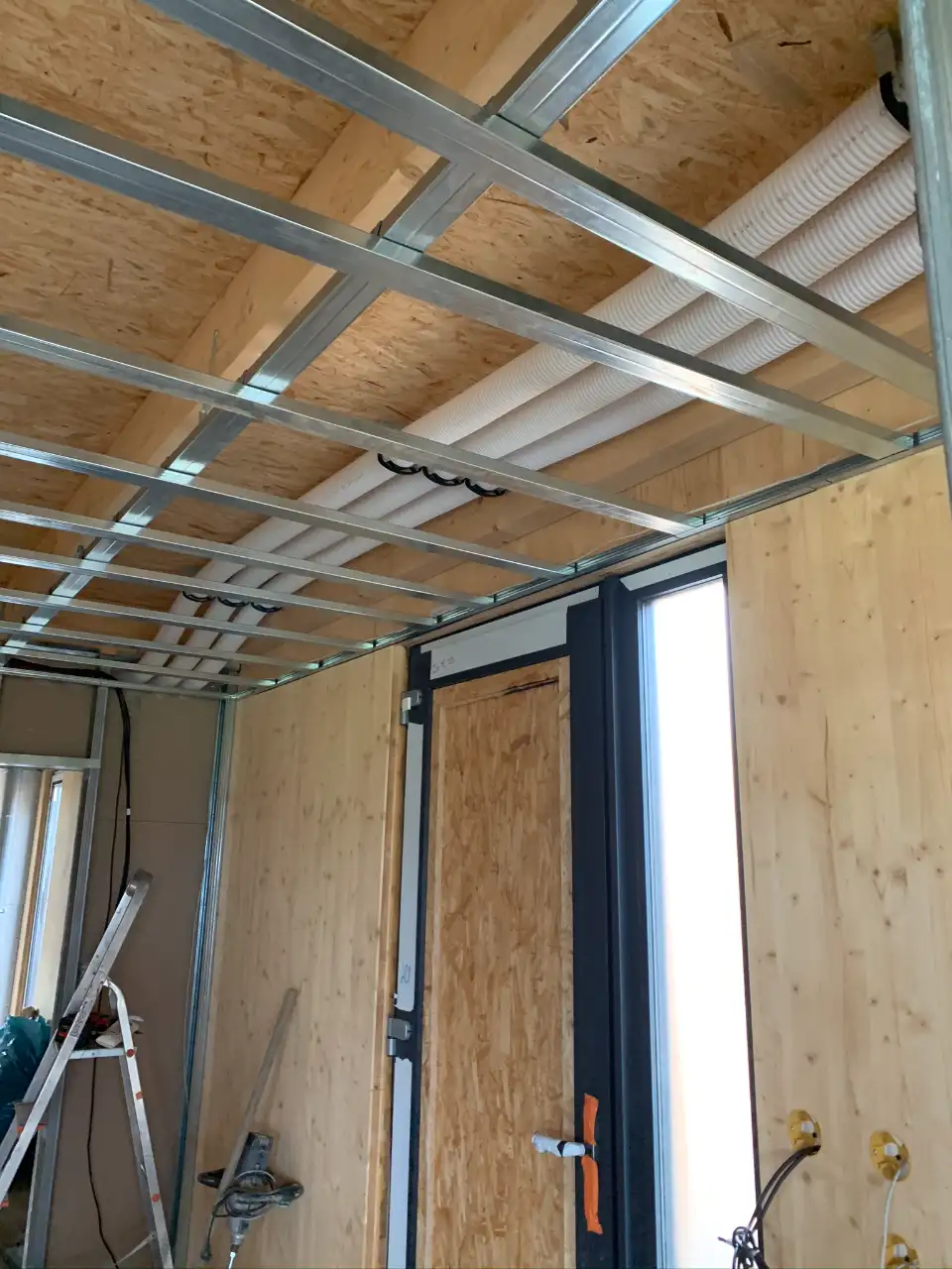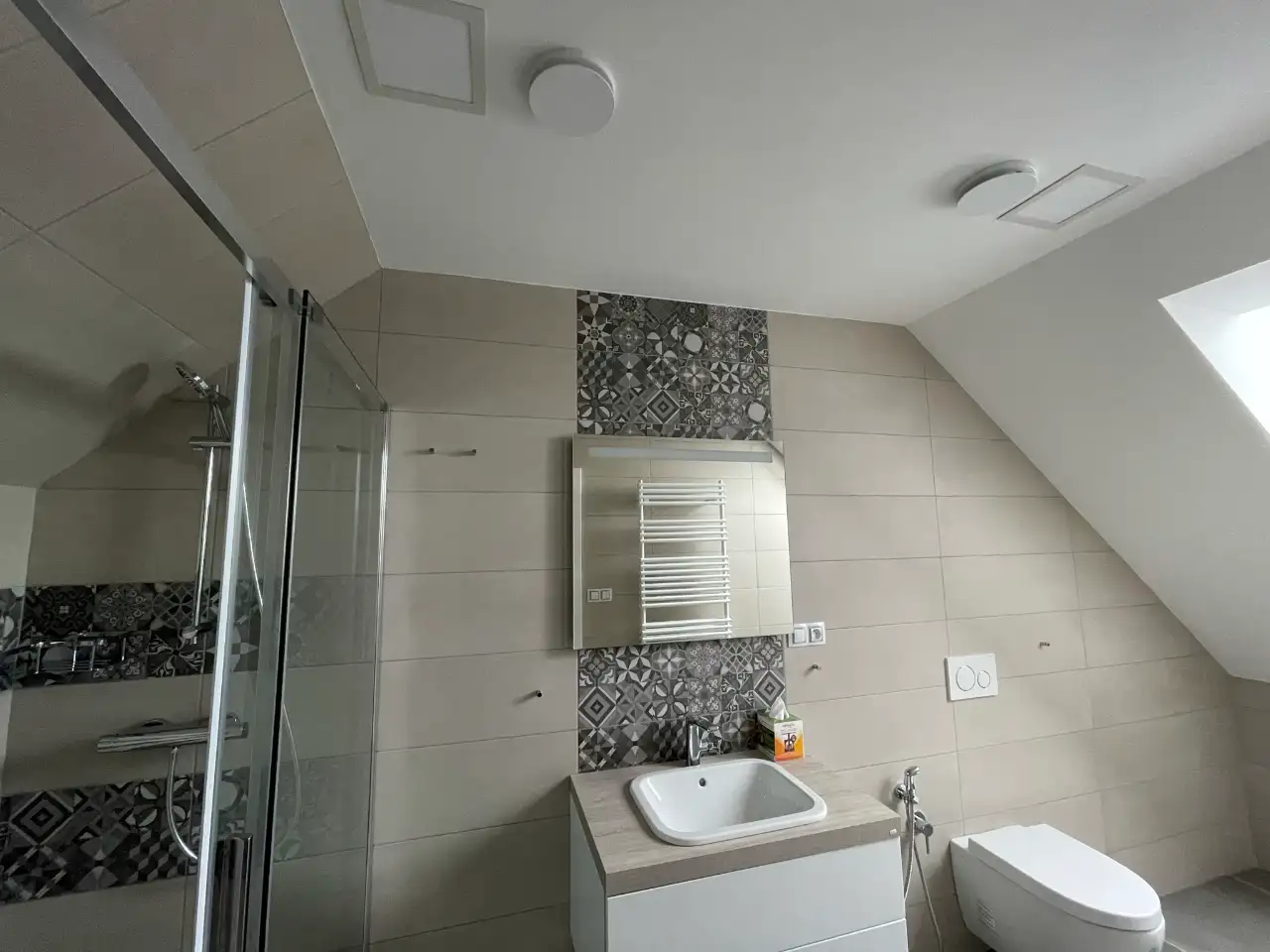 Realizace systému řízeného větrání u této dřevostavby probíhala od prvních příprav až po finální měření těsnosti. Nejprve jsme připravili trasy a prostupy pro rozvody vzduchu, které jsme následně uložili do stropních a stěnových konstrukcí. Ve všech místnostech jsme instalovali potrubí Zehnder ComfoTube, které jsme pečlivě vedli tak, aby zůstalo kompletně skryté a nenarušovalo interiér. Na koncích rozvodů byly osazeny kryty vývodu vzduchu TVA-P a talířové ventily ComfoValve, které zajišťují přesné a tiché proudění vzduchu.